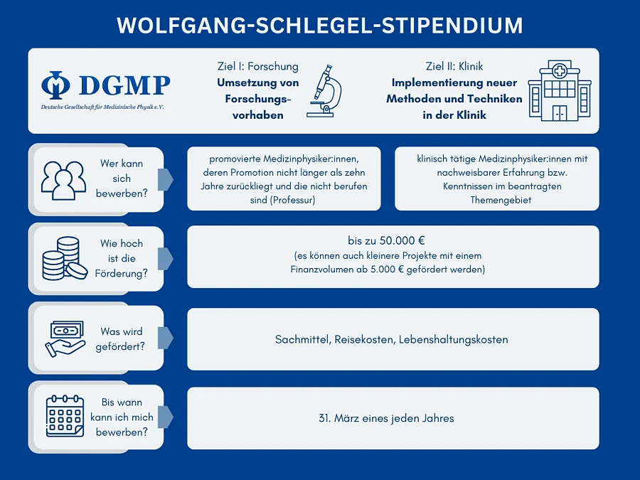 Um den wissenschaftlichen Austausch und Fortschritt in der Medizinischen Physik zu fördern, unterstützt die DGMP mit dem Wolfgang-Schlegel-Stipendium externe Aufenthalte in Institution im In- oder Ausland für die Dauer von maximal 12 Monaten. Der Aufenthalt soll eines der beiden nachfolgenden Ziele verfolgen: